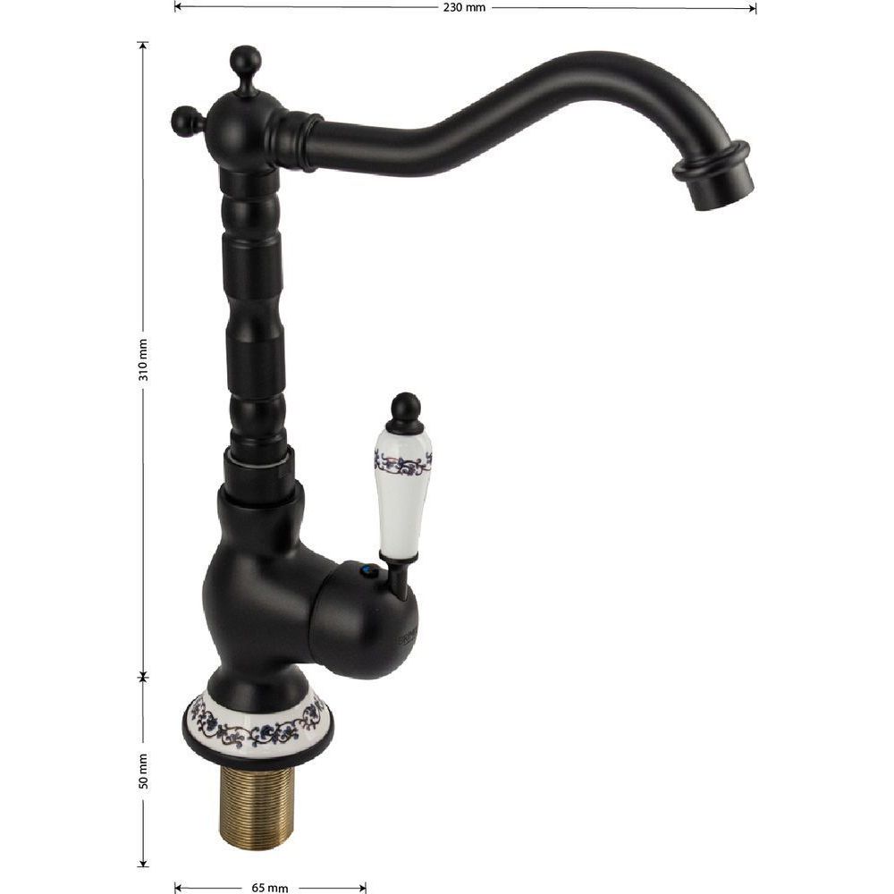 Смеситель для кухонной мойки и раковин, боковой, шаровый, черный с вставками белой керамики, с высоким Г-образным, поворотным вокруг оси изливом. Материал изготовления — латунь. Крепление резьба - гайка, картридж d = 40 мм, литая ручка. Аэратор для экономии воды. Габаритные размеры: высота 310 мм, длина 230 мм, диаметр посадочного седла 65 мм, длина резьбы 50 мм, длина подводки 400 мм. Вес - 1,250 кг, объём - 0,00680 м3. В комплекте паспорт, корпус с изливом, подводка 1/2, крепеж, набор прокладок. Вес - 1,3 кг, объект - 0,005 м3.