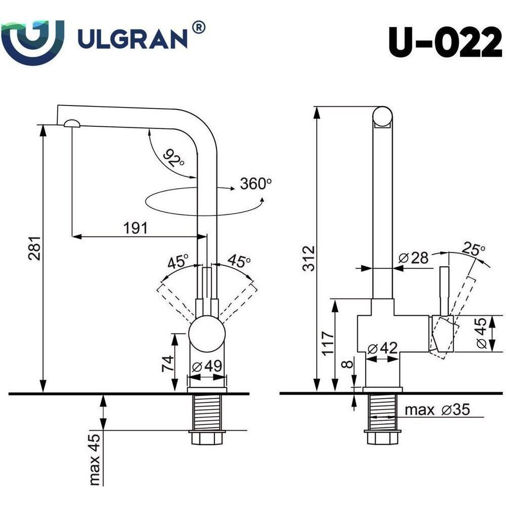 Смеситель для кухни Ulgran U-022, высота излива 281 мм, материал нержавеющая сталь, цвет антрацит.