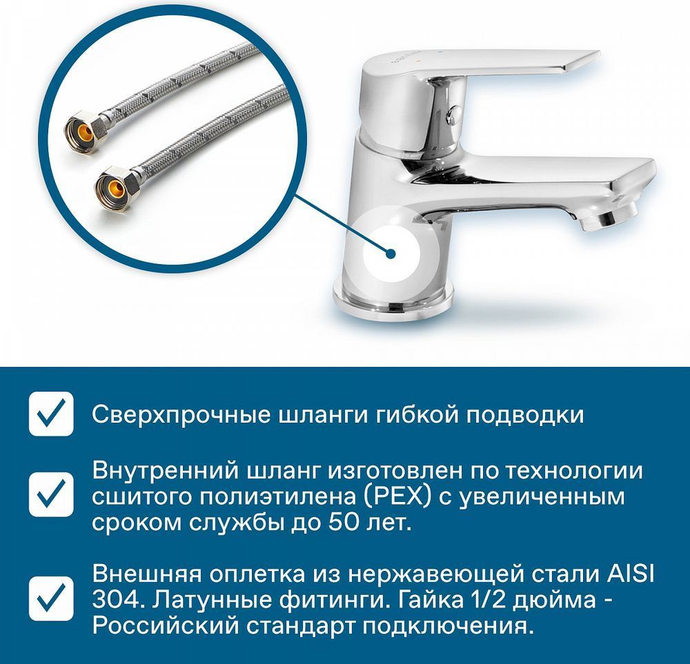 сверхпрочные шланги гибкой подводки, изготовленные по технологии сшитого полиэтилена (PEX) и сроком службы до 50 лет, в оплетке из нержавеющей стали AISI 304