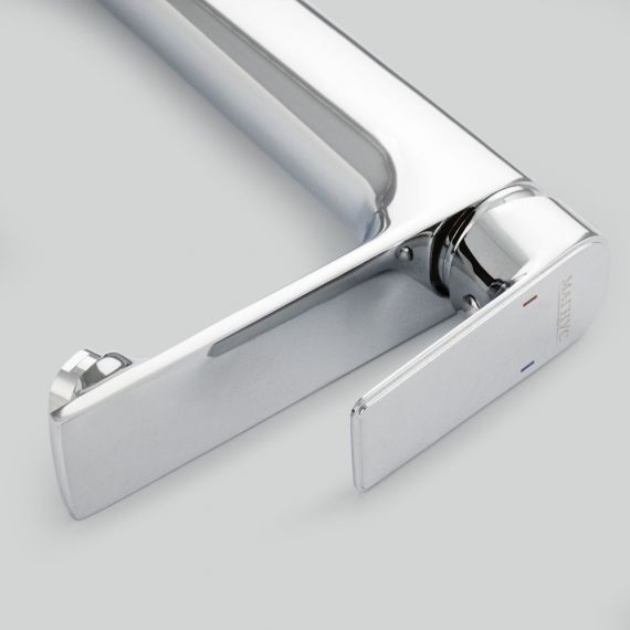 Смеситель для раковины, высокий хромированный литой корпус, с прямым плоским изливом, ручка литая, шаровый. Крепление резьба - гайка, картридж d = 35 мм. Аэратор для экономии воды. Такая модель может использоваться на домашней кухне, на даче, в медицинских учреждениях и общественных местах. Габаритные размеры: высота 305 мм, длина 170 мм, посадочное седло 45*45 мм, длина резьбы 35 мм, длина подводки 500 мм. Вес - 1,500 кг, объём - 0,00546 м3. В комплекте паспорт, корпус, подводка 1/2, крепеж, набор прокладок.