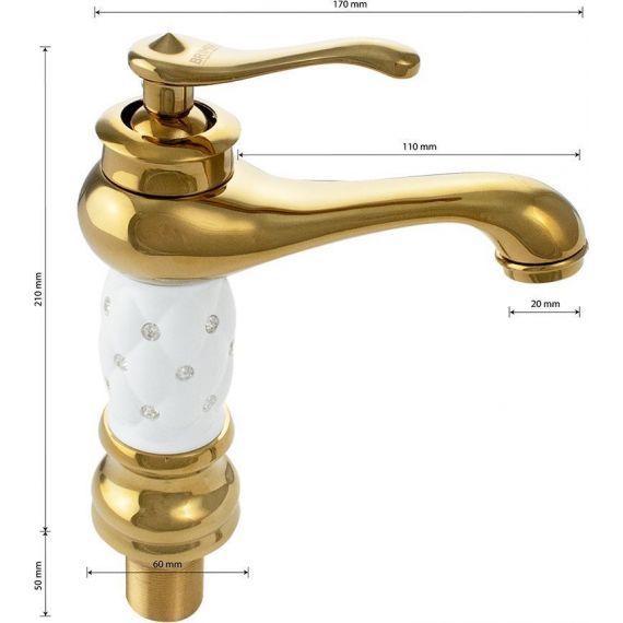 Смеситель для раковины, светлое золото с белой керамичекой вставкой, со стразами на корпусе, с коротким литым изливом, литой корпус, литая ручка, шаровый. Материал изготовления — ЦАМ (цинк-алюминий-медь) + нержавеющая сталь. Крепление резьба - гайка, картридж d = 40 мм. Аэратор для экономии воды. Габаритные размеры: высота 210 мм, длина 170 мм, длина излива 110 мм, диаметр посадочного седла 60 мм, длина резьбы 50 мм, длина подводки 400 мм. Вес - 1,150 кг, объём - 0,00346 м3. В комплекте паспорт, корпус, подводка 1/2, крепеж, набор прокладок.