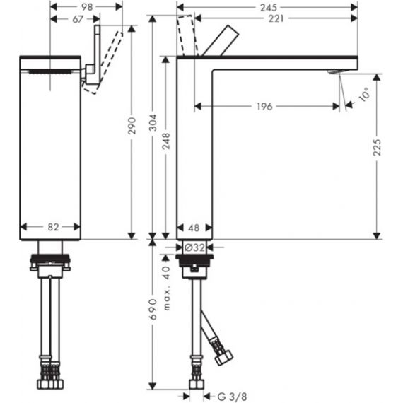 рукоятка расположена в верхней части корпуса (обычно для раковин в форме таза)
