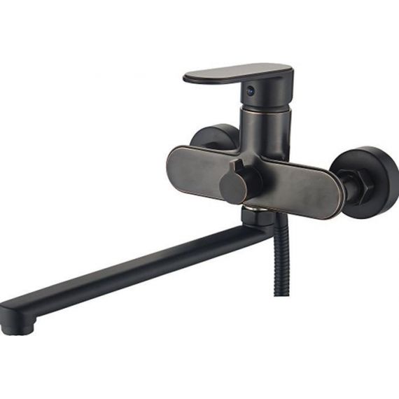 Смеситель для ванны Gerhans K13122T с душевым гарнитуром и длинным изливом, количество режимов душевой лейки - 3, длина душевого шланга - 150 см, материал - латунь, цвет - чёрная бронза.