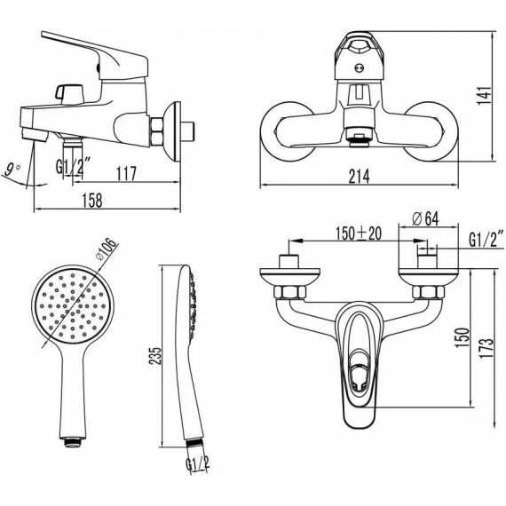 Аксессуары в комплекте: шланг 1,5 м, настенное поворотное крепление, 1-функциональная лейка Ø106x235 мм