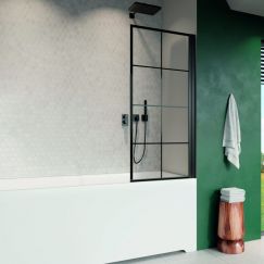 Шторка для ванны Radaway Nes Black PNJ I Factory 900х1500 мм. Цвет профиля – черный, цвет стекла – прозрачное с черной решеткой из керамической краски, 6 мм. Размеры с диапазоном регулировок: 900-915 мм.